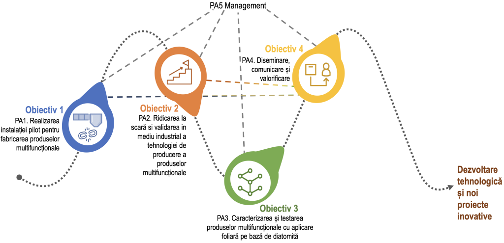 Obiectivele proiectului sunt:(i) dezvoltarea unei instalații pilot pentru fabricarea produselor multifuncționale cu aplicare foliară pe bază de diatomită; (ii) validarea tehnologiei pilot de producere a produselor multifuncționale cu aplicare foliară pe bază de diatomită în mediu industrial; (iii) demonstrarea funcționalității tehnologiei în mediu industrial prin caracterizarea și testarea produselor multifuncționale cu aplicare foliară pe bază de diatomită realizate pe instalația pilot.