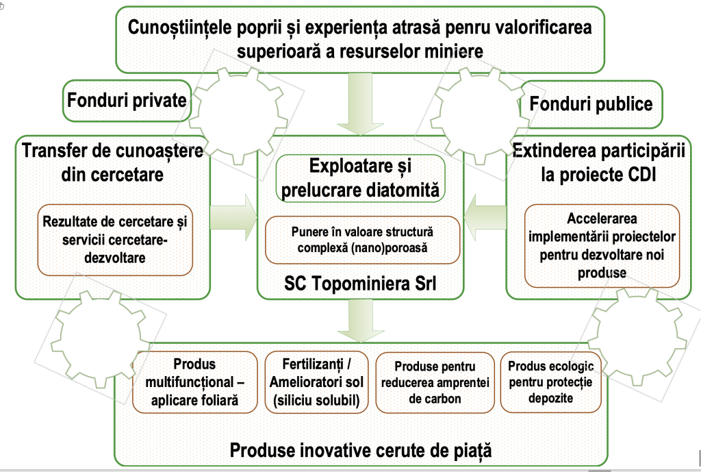 Scopul proiectului este creșterea competitivității întreprinderii coordonatoare, Topominiera S.R.L., și a fermierilor utilizatori ai produselor multifuncționale cu aplicare foliară pe bază de diatomită propuse prin proiect, prin asimilarea unui rezultat CDI.
